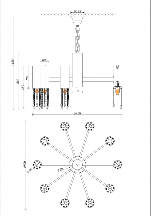 Размеры светильника: ширина 800 мм, высота мм. - такие размеры позволяют люстре идеально смотреться как в просторных, так и в небольших помещениях.
