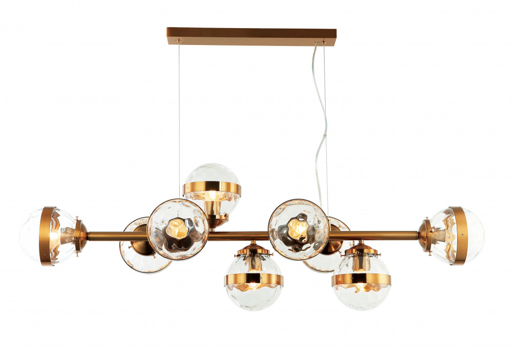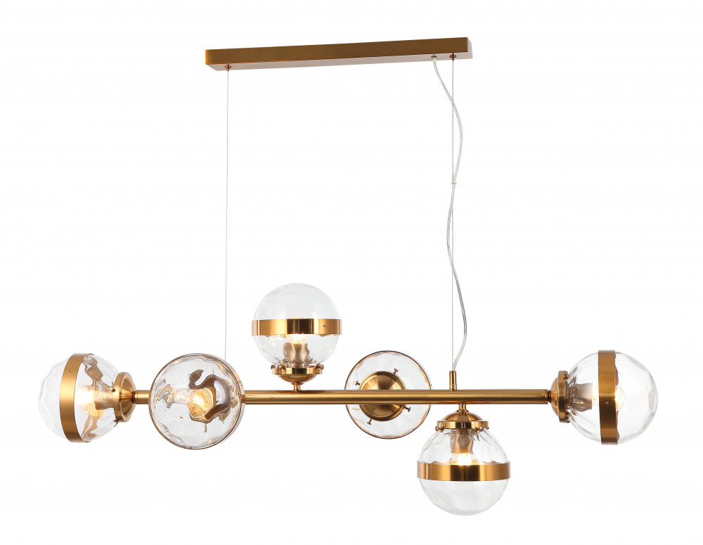 Корпус подвесной люстры выполнен из прочного металла, а золотой цвет придаст вашему интерьеру изысканности. Плафон выполнен в прозрачном цвете, что добавляет модели легкости, элегантности и завершенность образа.