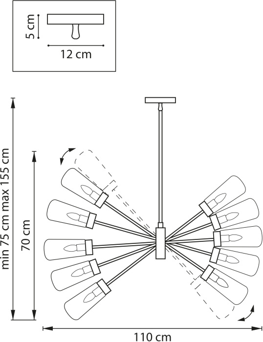 Размеры светильника: ширина 1100 мм, высота 700 мм. Такие размеры позволяют люстре прекрасно вписываться как в просторные, так и в небольшие помещения.