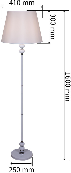 Размеры этого торшера – ширина 410 мм., высота 1600 мм. Он идеально подойдёт для комнаты площадью до кв.метров. Для создания подходящего освещения здесь использовано 1 ламп с цоколем E27 и общей мощностью 60 Вт.