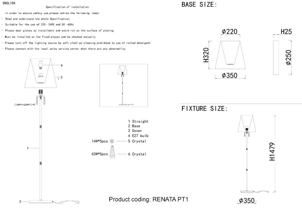 Размеры этого торшера – ширина 350 мм., высота 1480 мм. Он идеально впишется для комнаты площадью до 4 кв.метров. Для создания подходящего освещения здесь использовано 1 ламп с цоколем E27 и общей мощностью 60 Вт.